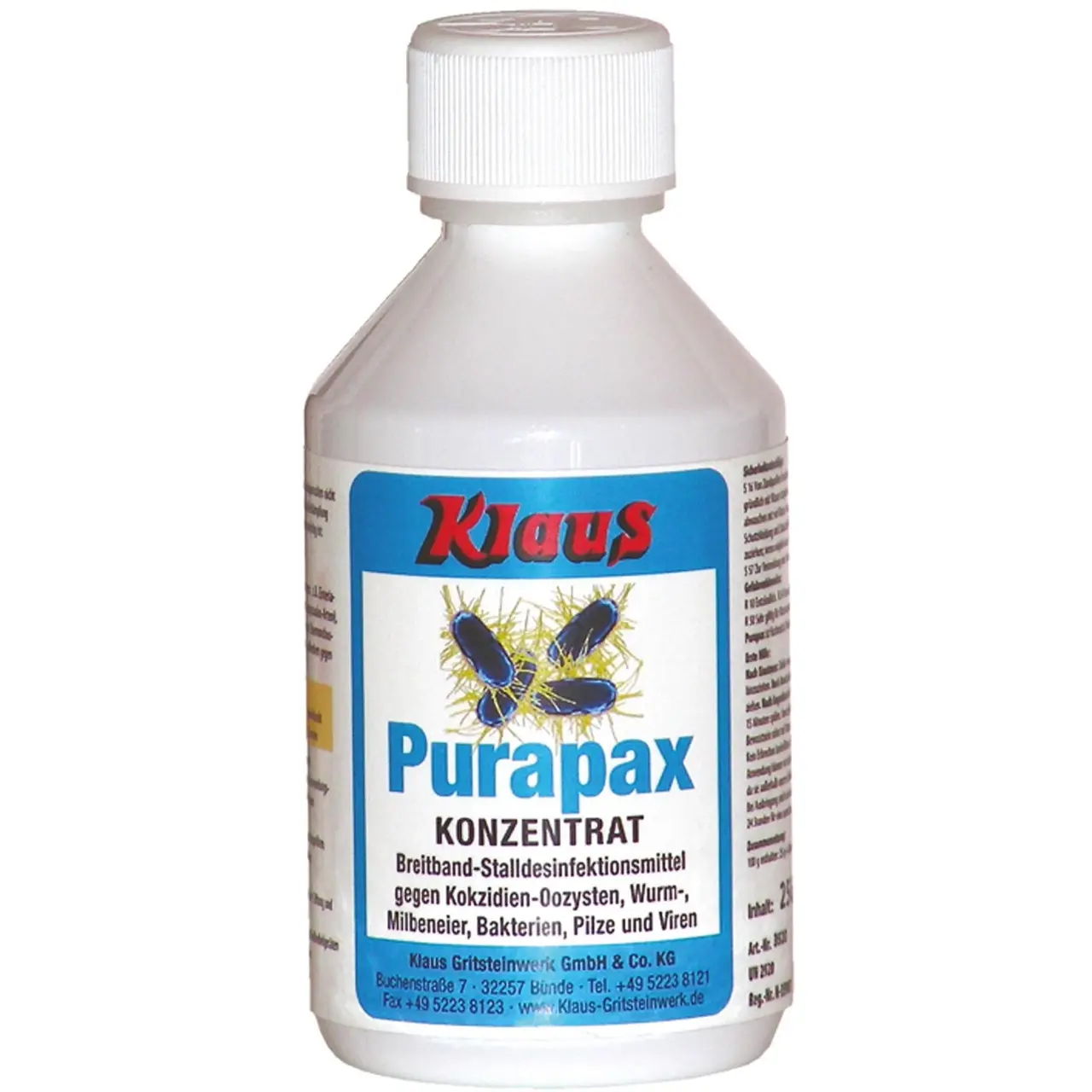 Kasutusalad: tavalised desinfektsioonivahendid ei suuda tappa endoparasiitide püsivaid vorme. Seetõttu kasutatakse Purapaxi kõikjal, kus koktsiidide ootsüstide, ussimunade ja ussivastsete tõrje on eriti oluline: linnumajades, sigalates ja veiste nuumamisel.