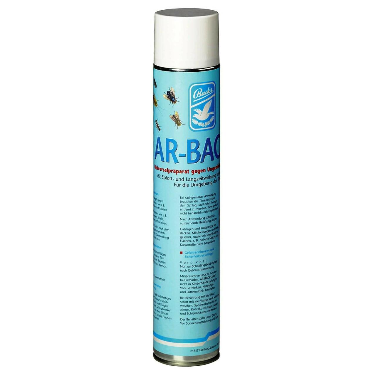 Kasutus- ja annustamisjuhised: AR-BACKS on kasutusvalmis pihusti. Enne kasutamist loksutada purki. Pihusta alasid, peidukohti ja jalutusalasid, mida eelistavad kahjurid ja kärbsed umbes 30 cm kauguselt, kuni alad tunduvad kergelt niisked. Õige kasutamise korral ei pea loomi/linde kanalast ega puuridest eemaldama. Tagage piisav ventilatsioon kohe pärast kasutamist.