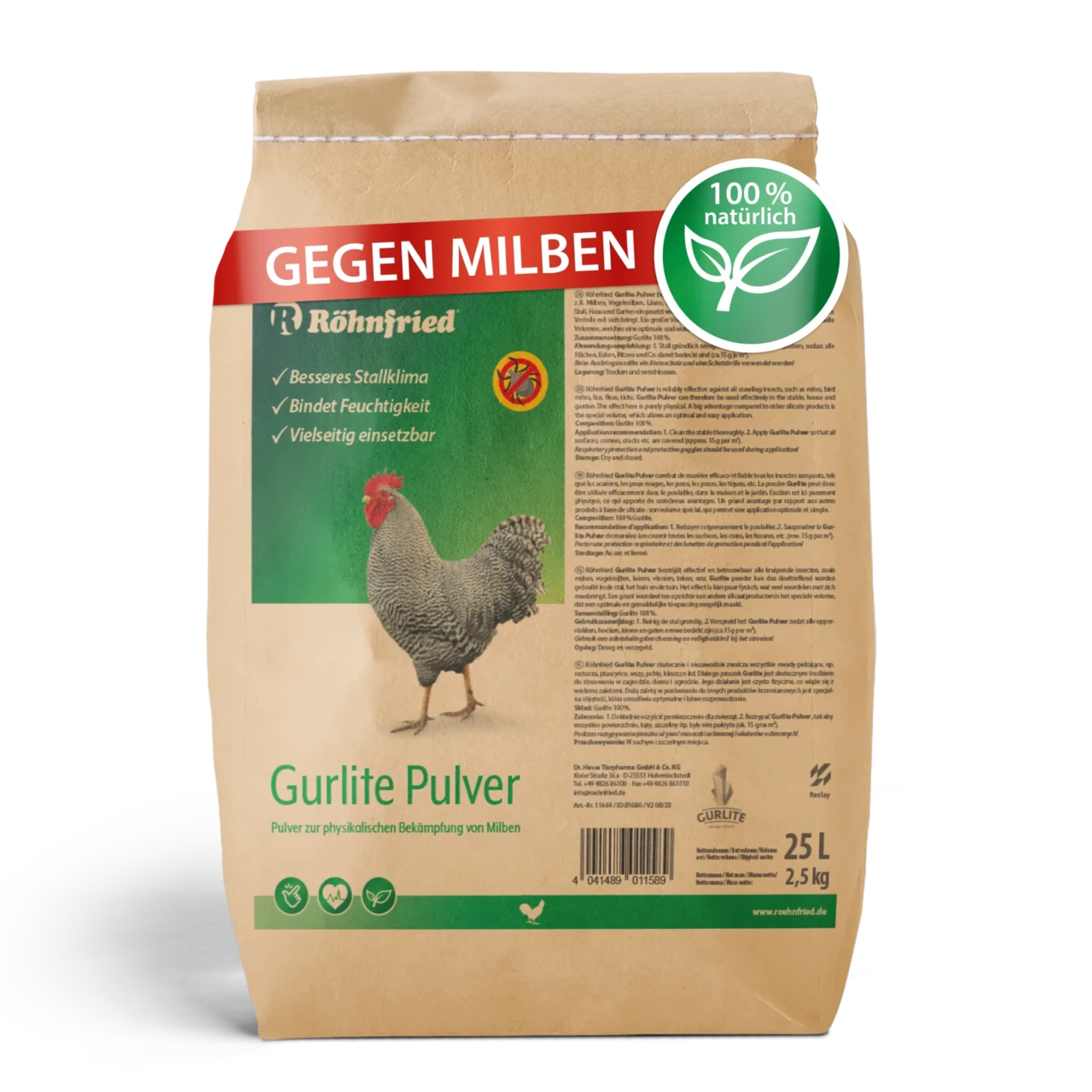 Röhnfried Gurlite pulber võitleb tõhusalt ja usaldusväärselt kõigi roomavate putukatega, nagu väivid, linnulestad, täid, kirbud, puugid jne. Seetõttu saab Gurlite pulbrit tõhusalt kasutada laudas, kodus ja aias. Mõju on puhtalt füüsiline, millel on palju eeliseid. Suur eelis teiste silikaattoodete ees on eriline maht, mis võimaldab optimaalset ja lihtsat pealekandmist.