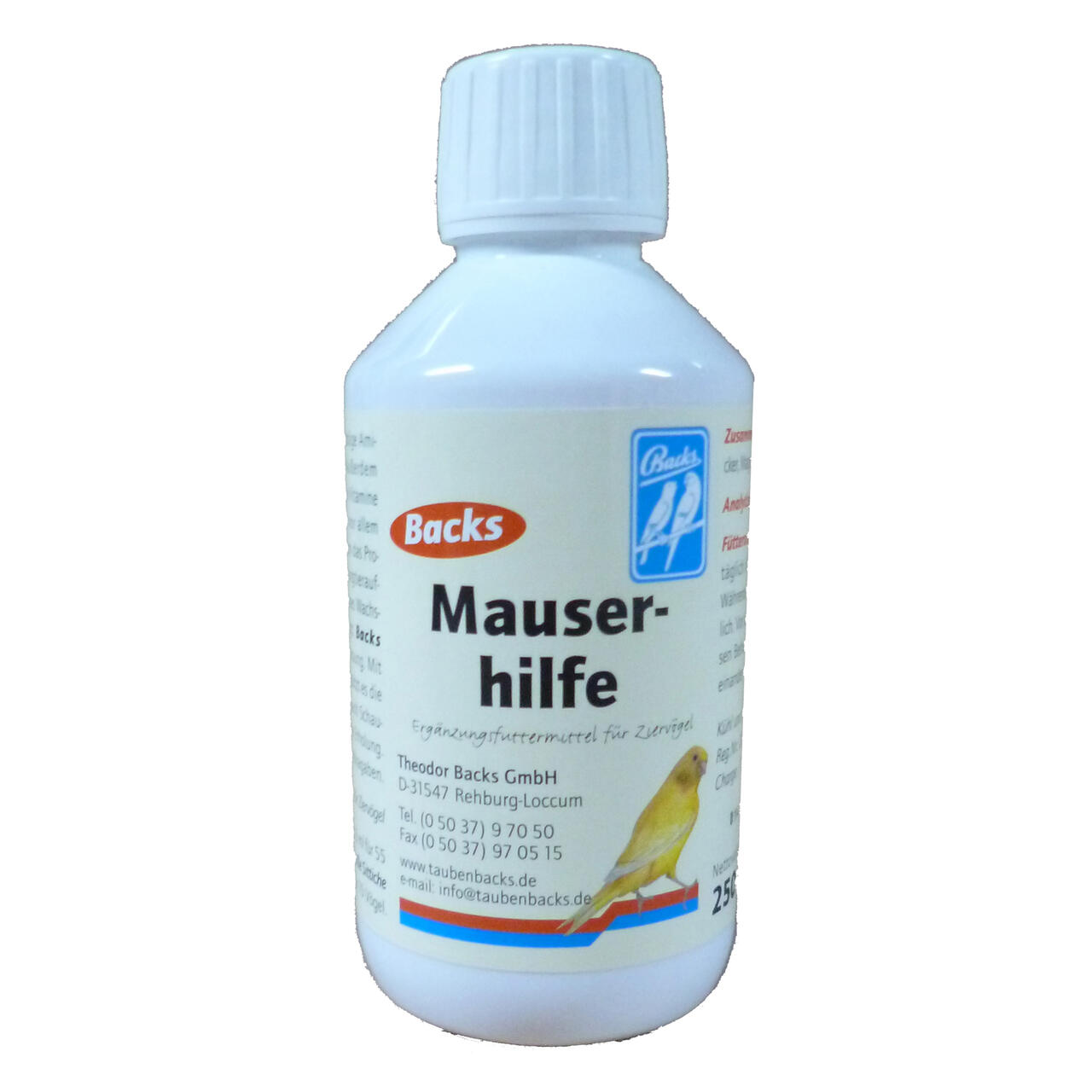 Sisaldab kõiki asendamatuid aminohappeid suures kontsentratsioonis. Backs Mauserhilfe sisaldab ka elektrolüüte ja B-kompleksi vitamiine. Backs Mauserhilfe sisaldab suures kontsentratsioonis asendamatuid aminohappeid arginiini, histidiini, isoleutsiini, leutsiini, lüsiini, metioniini, fenüülalaniini, treoniini, trüptofaani ja valiini. See teeb Backs Mauserhilfe'ist sulgimiseks mõeldud toote, seda peamiselt väävlit sisaldavate aminohapete tõttu. Backs sulgimisabi tagab ka sulestiku sujuva kasvu poegade üleskasvatamise ajal. Muud kasutusvaldkonnad on enne ja pärast näitusi ning pärast antibiootikume ja vaktsineerimisi.