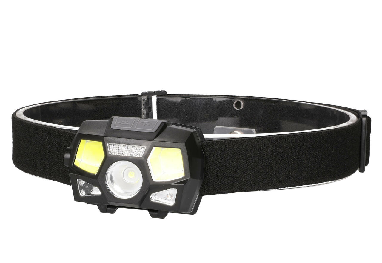Kahekordne blister. USB-taaslaetav. 2 x COB LED, 1 x XPE LED, punane LED valgus, andur.
