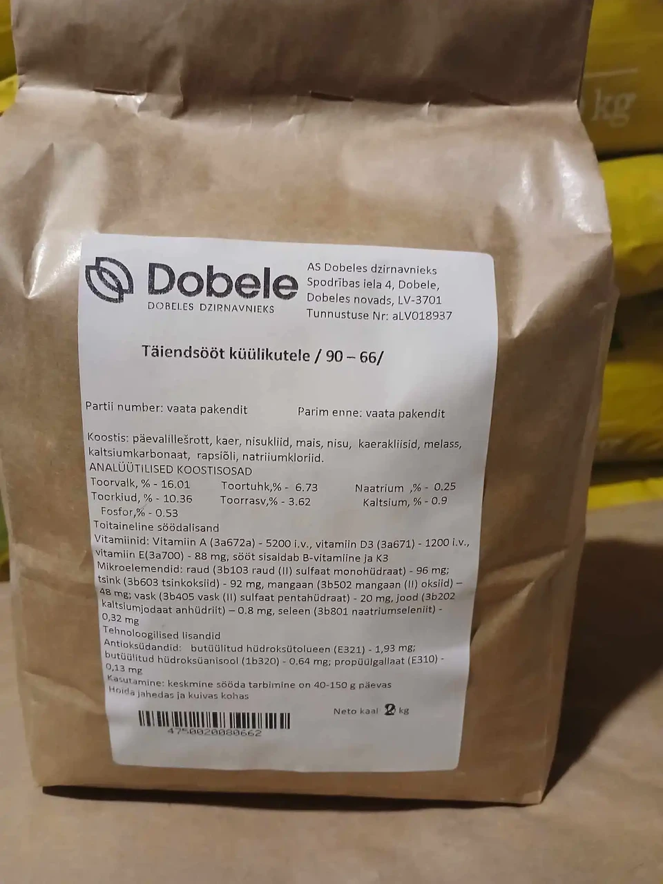Koostis: päevalillešrott, kaer, nisukliid, mais, nisu, kaerakliisid, melass, kaltsiumkarbonaat, rapsiõli, naatriumkloriid.Toidulisandid: Vitamiinid A, D3, E, B ja K3