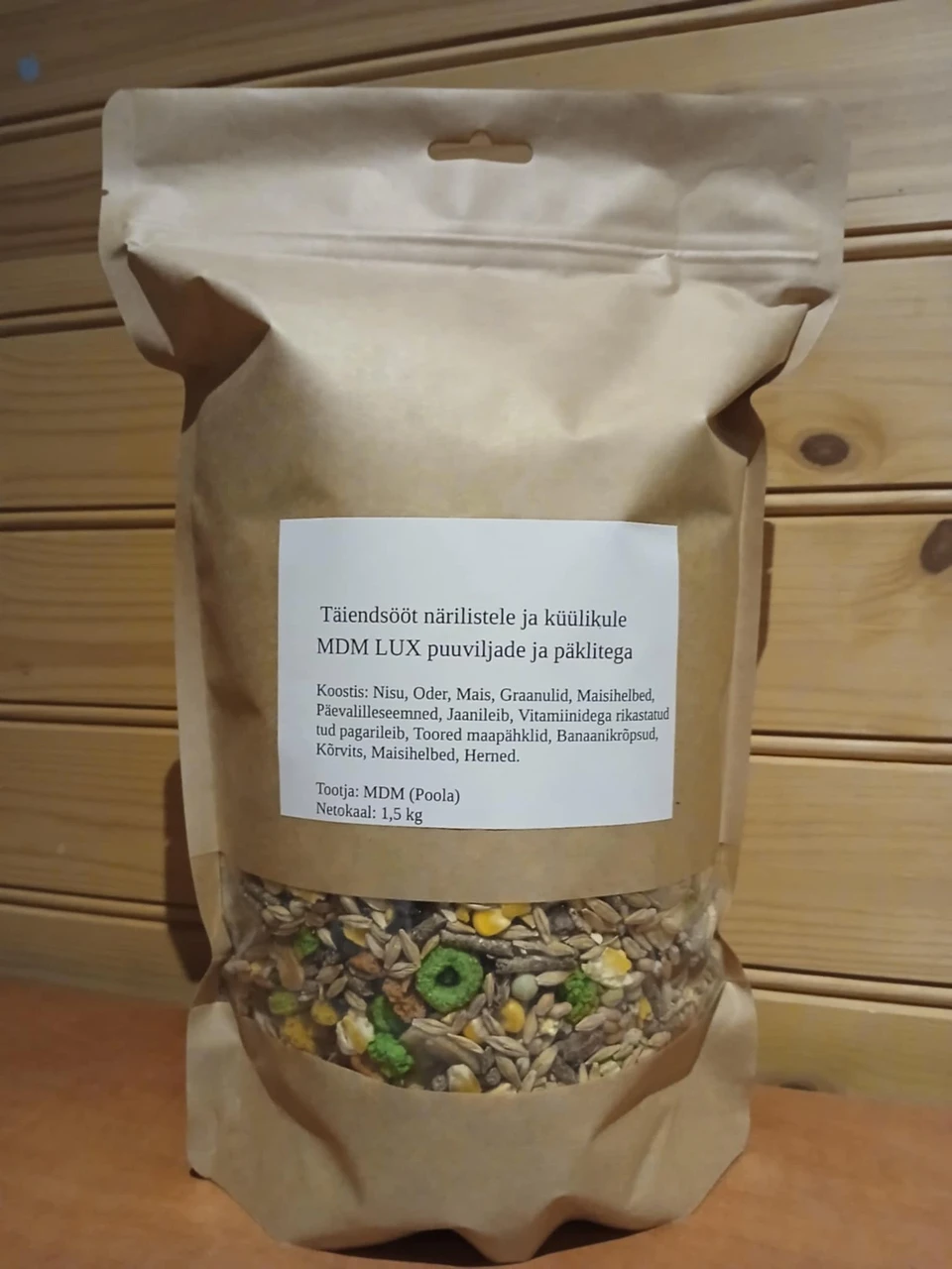 Koostis: Nisu, Oder, Mais, Graanulid, Maisihelbed, Päevalilleseemned, Jaanileib, Vitamiinidega rikastatud pagarileib, Toored maapähklid, Banaanikrõpsud, Kõrvits, Maisihelbed, Herned.