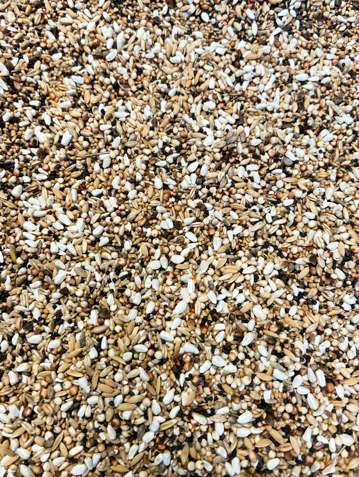 Kooritud kaer 5%, Nisu 5%, Kanepiseemned 5%, Lina 2%, Kanaari seemned 2%, Agrimony 1%, Raps 1%, Maria ohaka seeme 1%, Tatar 0,50%