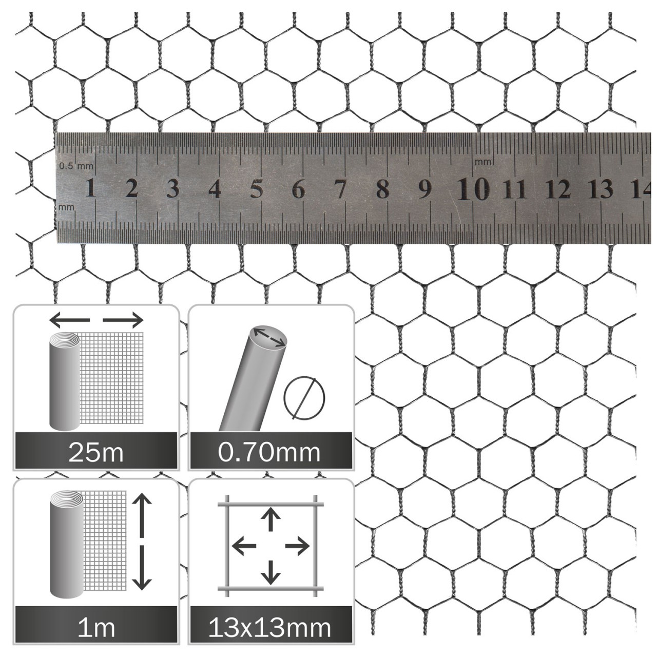 silm 13x13 mm, traadi läbimõõt 0,7 mm, rull 25 x 1,0 m , kaal 11,3 kg.