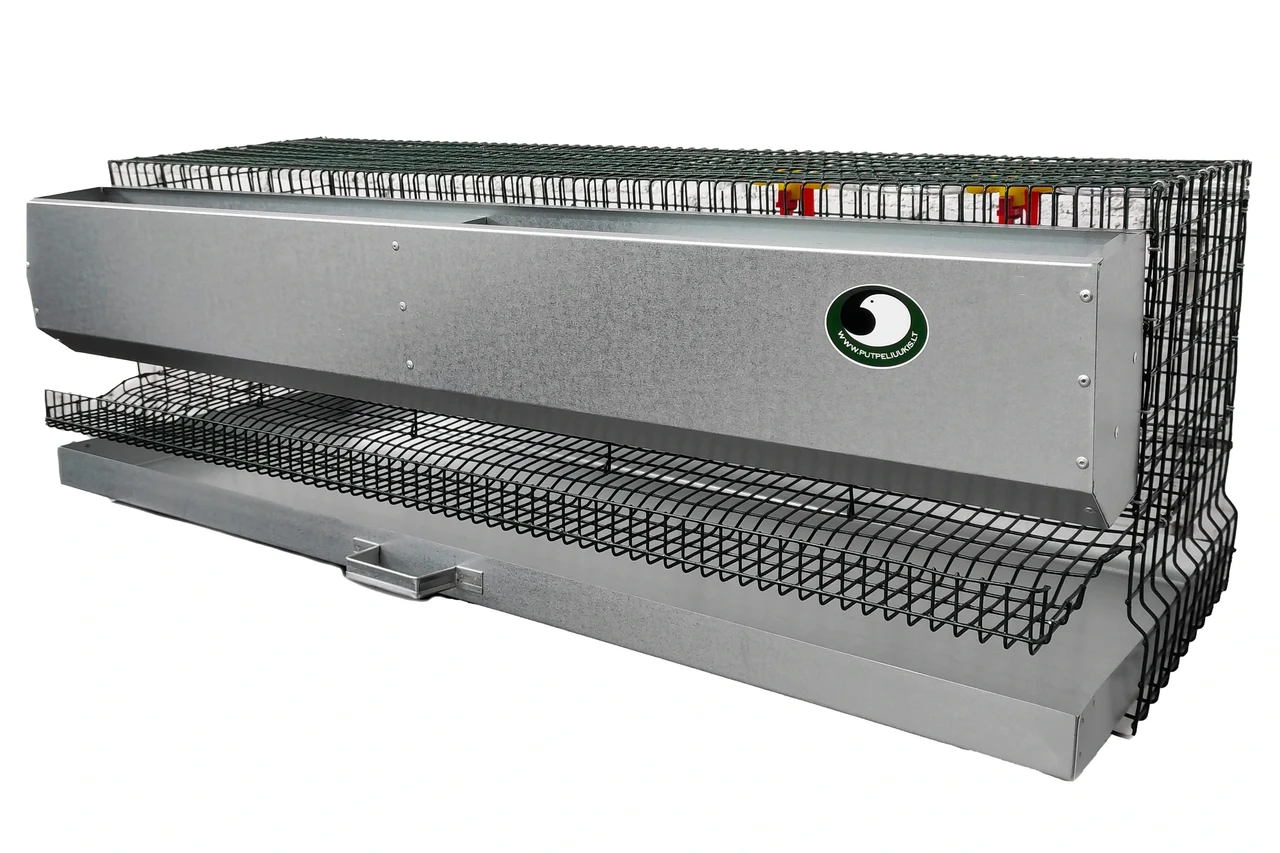 Tsingitud PVC-ga kaetud võrk. Puur on varustatud spetsiaalse punkersööturiga, mis vähendab sööda kadu minimaalseks. Kaks nippeljooturit, paak ei kuulu komplekti, kuid kaasas on ühendusvoolik 15mm. Väljaheidete kogumisplaadi ja munarenniga.